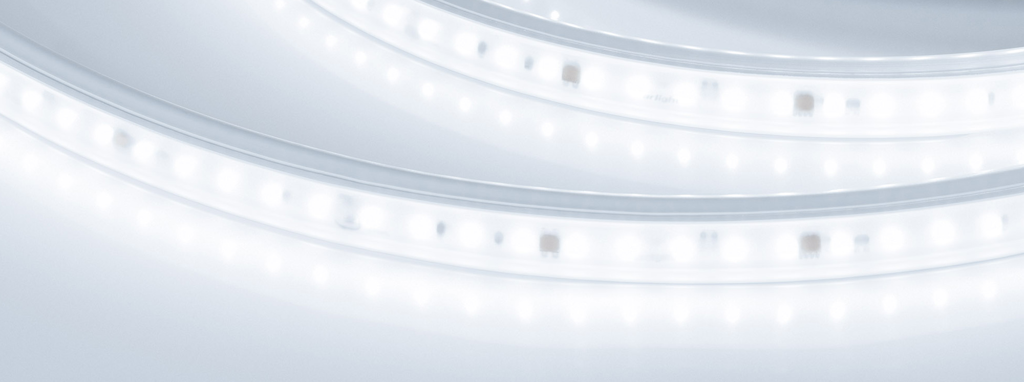 Светодиодная герметичная лента ARL серии A84 со степенью защиты IP65, защитная оболочка из ПВХ устойчива к УФ излучению. Высокий индекс цветопередачи CRI>85 обеспечивает точное восприятие цветовых оттенков. Лента подключается непосредственно к сети переменного тока 230 В и не требует использования источников питания. Наличие интегральных стабилизаторов тока позволяет подключать ленту длиной до 50 м, обеспечивая при этом равномерную яркость свечения по всей длине ленты. При подключении нескольких лент необходимо подавать питание на каждые 50 м отдельным кабелем, последовательное подключение лент более 50 м запрещается. Лента применяется для декоративной подсветки помещений, потолочных ниш, создания контуров рекламных объектов внутри помещений. Ленты обладают низким коэффициентом пульсаций FlickerFree <2%. Для расчета потребляемой мощности необходимо учитывать коэффициент мощности - PF>0.75. На лентах установлены микросхемы с функцией снижения тока для защиты ленты от перегрева, обеспечивающие надежную работу в различных условиях. Диммирование в диапазоне 30%-90% осуществляется TRIAC диммерами с установкой минимального уровня яркости, при диммировании коэффициент пульсаций увеличивается. Крепление с помощью скоб, аксессуары для монтажа и подключения поставляются отдельно.