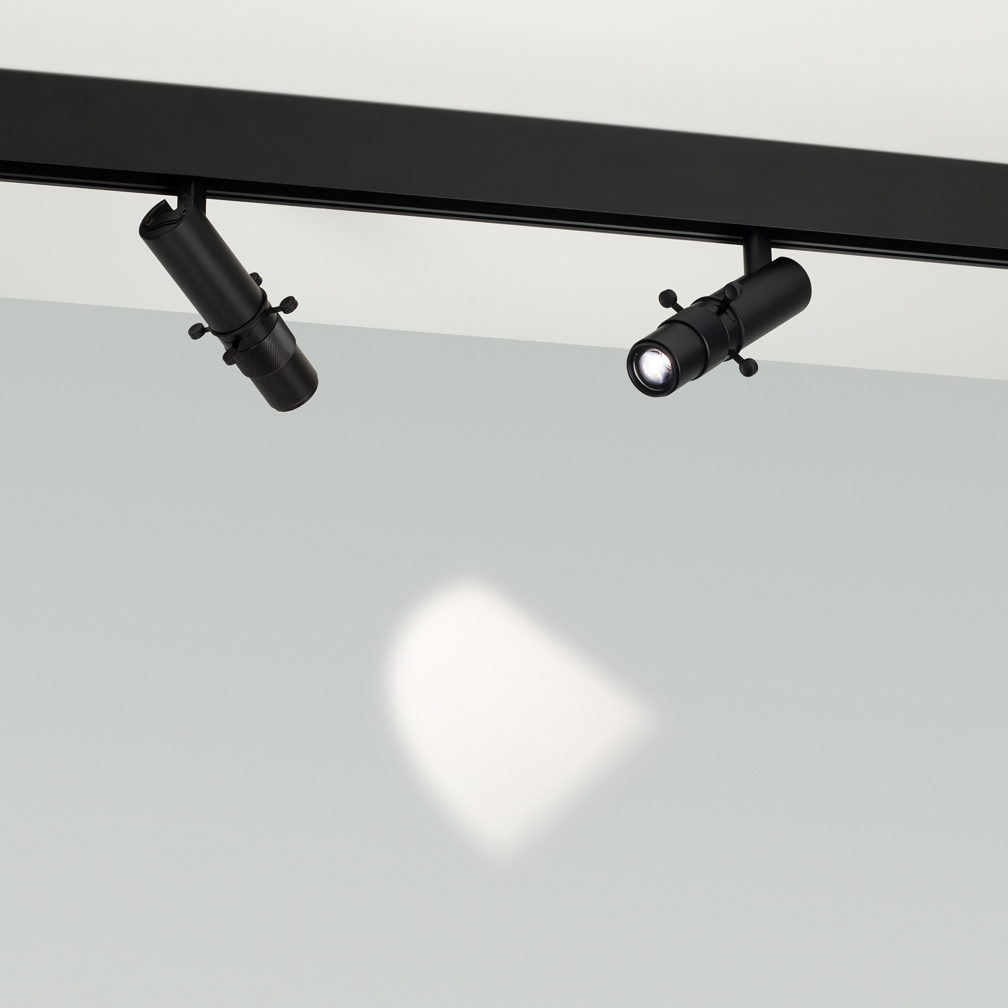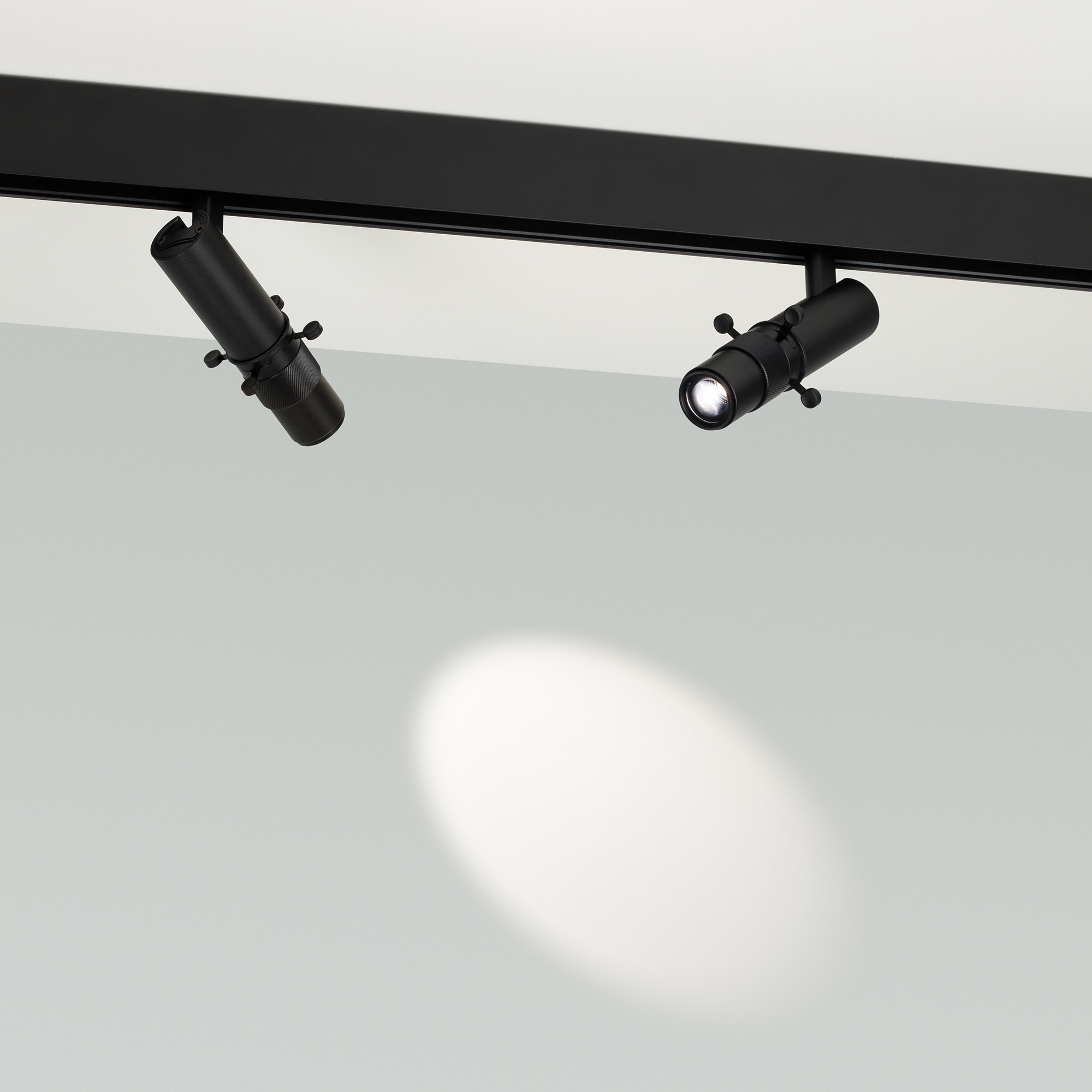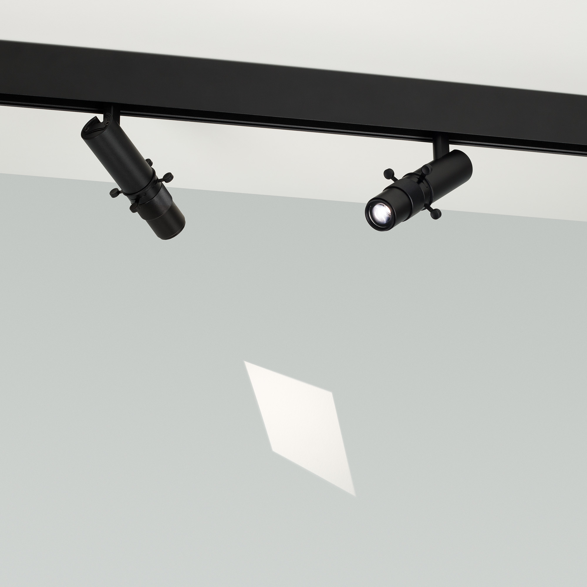 Светильник с кадрируемой оптикой и изменяемым углом для магнитных треков MAG-ORIENT шириной 26 мм. Мощность 6 Вт, св. поток 75-130 лм, 22 лм/Вт, дневной 4000 K, CRI>98, угол 19-29°, напряжение питания 48 В. Черный фигурный корпус из металла, степень защиты IP20. Размеры LxWxH 126x35x195 мм. Длина светоизлучающего модуля 140мм. Монтаж на трек MAG-ORIENT. Пульсация <1%.