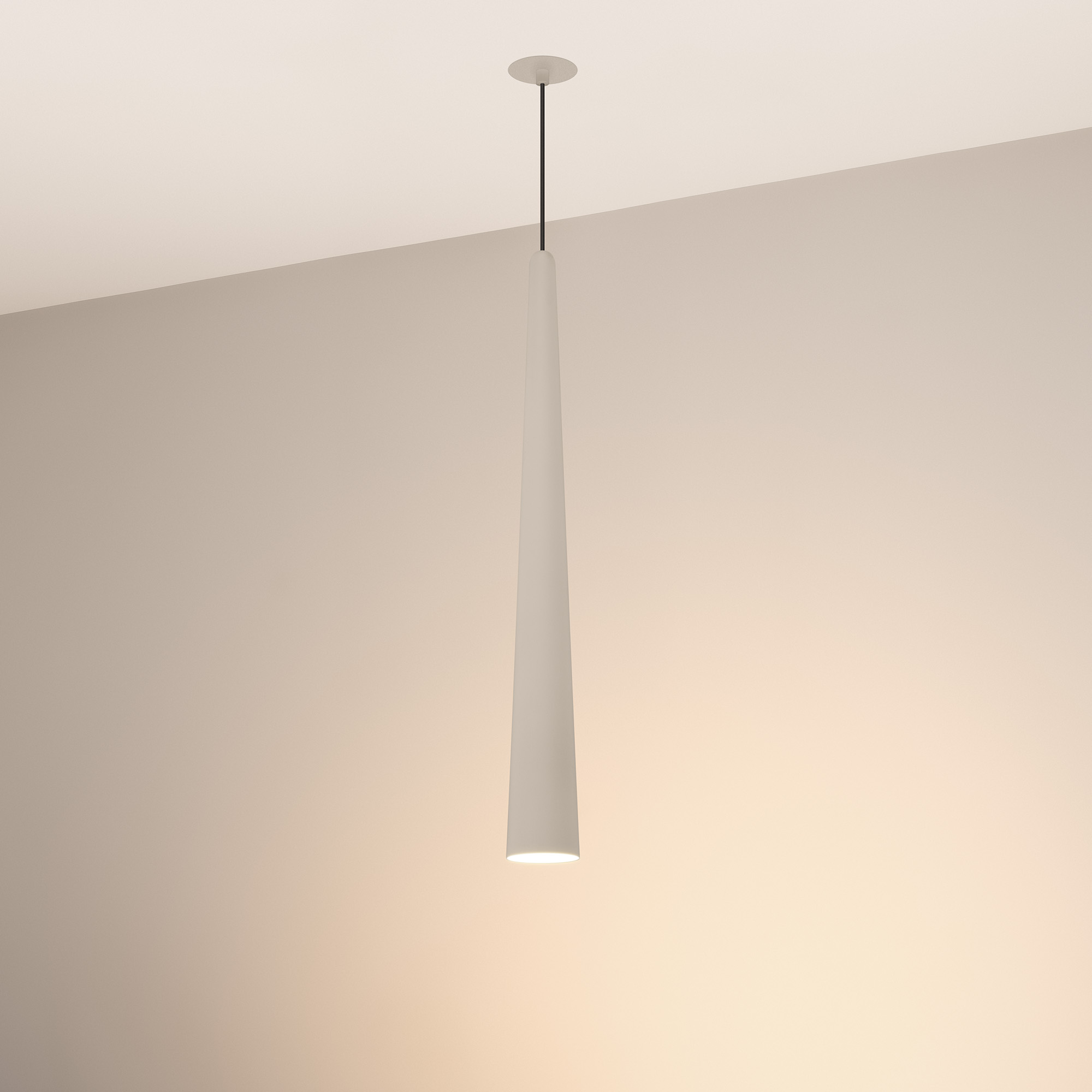 Подвесной светильник. Мощность 5 Вт, св. поток 400 лм, 70 лм/Вт, теплый 3000K, CRI>92, угол 36°, напряжение питания 230 В. Светло - серый конусообразный вытянутый корпус из алюминия, линза из PMMA, степень защиты IP20. Размер: диаметр 76 мм, высота 670мм. Монтаж подвесной, длина подвеса 2000 мм, регулируемая. В комплекте 2 вида чаш. Габариты встраиваемой чаши: Ø 80x41 мм. Габариты накладной чаши Ø80x60 мм. Драйвер 2,8-12В, 500 мА, пульсация <1%.